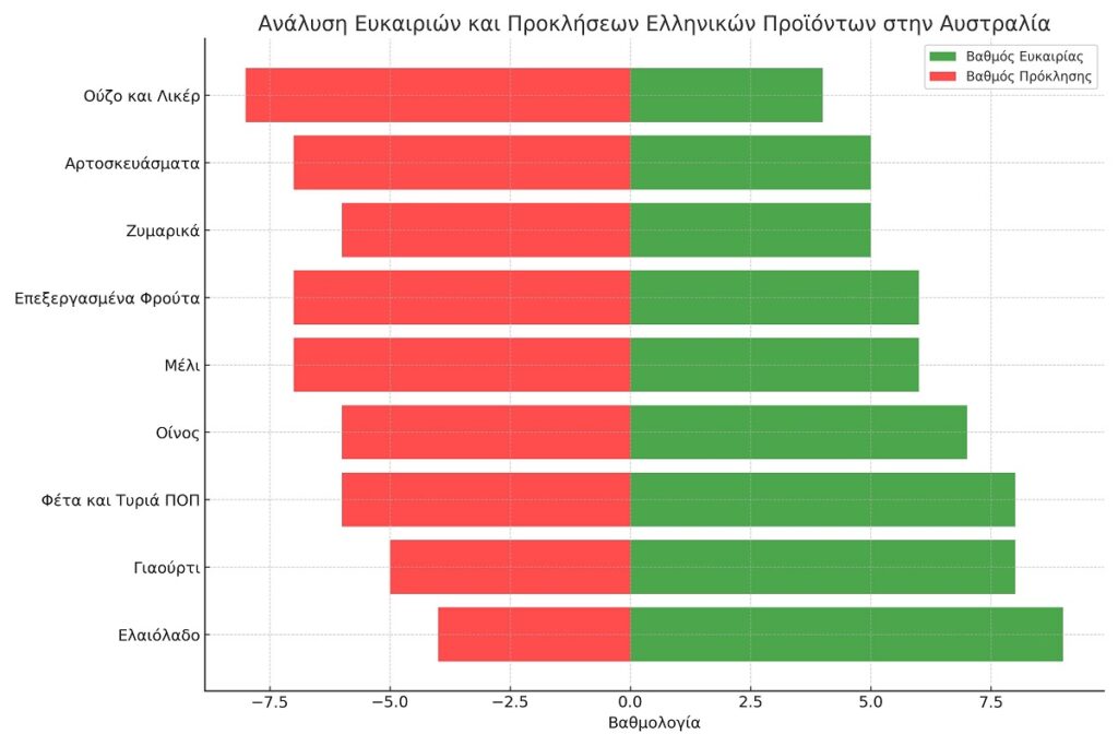 Συγκεκριμένα, στο γράφημα που δημιούργησε η Τ.Ν. απεικονίζονται τα εγχώρια προϊόντα που έχουν προοπτικές εξαγωγής στην Αυστραλία, αναλύοντας ταυτόχρονα: α) τον βαθμό ευκαιρίας (θετικές προοπτικές στην αγορά) και β) τον βαθμό πρόκλησης (δυσκολίες και εμπόδια εισόδου στην αγορά).