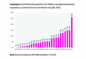 Σύμφωνα με τα ευρήματα της έκθεσης του Ινστιτούτου της ΓΣΕΕ, το 26% των επιχειρηματικών επενδύσεων στην Ελλάδα για το 2023 χρηματοδοτήθηκε μέσω επενδυτικών χορηγήσεων, κυρίως από το Ταμείο Ανάκαμψης. Το ποσοστό αυτό, μάλιστα, είναι το υψηλότερο στην Ευρωπαϊκή Ενωση. Είναι χαρακτηριστικό πως η δεύτερη στη σειρά Πολωνία ανέρχεται σε ποσοστό μόλις 15%.