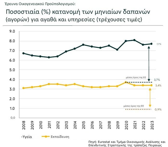 Από την άλλη, έχουμε την παροχή χαμηλής ποιότητας δημόσιων υπηρεσιών από το κράτος στα νοικοκυριά έναντι των φόρων αυτών. Και αυτό φαίνεται από το γεγονός ότι οι πολίτες αναλώνουν δικούς τους πόρους για να καλύψουν τις ανάγκες τους σε βασικές υπηρεσίες. Ειδικότερα τα ελληνικά νοικοκυριά αφιερώνουν το 7,7% των δαπανών τους για ιατροφαρμακευτική περίθαλψη (έναντι 3,7% στην Ε.Ε.) και το 3,4% για εκπαίδευση (έναντι 0,9% στην Ε.Ε.).
