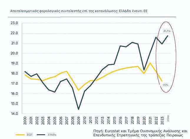Μπορεί να βελτιώνονται οι οικονομικοί δείκτες, αλλά τα νοικοκυριά εκφράζουν δυσαρέσκεια και απαισιοδοξία για το μέλλον, όπως δείχνουν διάφορες έρευνες. Κατά την παρέμβασή του ο Ηλίας Λεκκός, επικεφαλής Οικονομικής Ανάλυσης και Επενδυτικής Στρατηγικής του Ομίλου Τράπεζας Πειραιώς, υποστήριξε ότι αυτό το φαινόμενο οφείλεται στη μετάβαση από ένα κοινωνικό μοντέλο χαμηλής φορολογικής συμμόρφωσης και ταυτόχρονα χαμηλής προσφοράς δημόσιων υπηρεσιών σε ένα μοντέλο υψηλής και συνεχώς αυξανόμενης συμμόρφωσης, αλλά χωρίς την αντίστοιχη βελτίωση των προσφερόμενων δημόσιων υπηρεσιών. Ειδικότερα, από τη μία πλευρά καταγράφεται αυξημένη φορολογική επιβάρυνση της κατανάλωσης των νοικοκυριών, καθώς ο «αποτελεσματικός φορολογικός συντελεστής στην κατανάλωση» (δηλαδή ο λόγος φόρων κατανάλωσης που έχουν εισπραχθεί προς την προ φόρων κατανάλωση) διαμορφώνεται πλέον στα επίπεδα του 21,7%, αισθητά υψηλότερος από το 17,2% στην Ε.Ε.