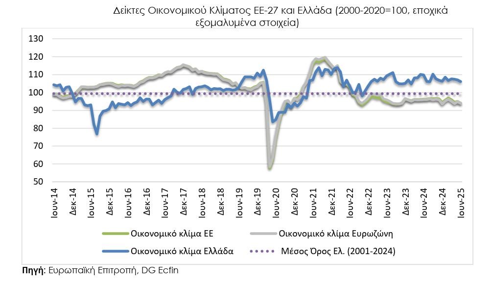 Στην πράξη, όταν ο δείκτης οικονομικού κλίματος ενισχύεται διαδοχικά, αυτό συχνά προοιωνίζεται επιτάχυνση της οικονομικής δραστηριότητας και αντίστροφα πτωτική πορεία του δείκτη μπορεί να υποδεικνύει αναμενόμενη επιδείνωση της οικονομικής κατάστασης. Ενα στοιχείο που εν όψει των εξελίξεων των επόμενων εβδομάδων/μηνών, έως τον Σεπτέμβριο (γεωπολιτική κατάσταση, διαπραγμάτευση ΗΠΑ και Ε.Ε. για δασμούς, πόσο καλά θα πάνε ο τουρισμός και η φοροείσπραξη και ως εκ τούτου ποια μέτρα θα ανακοινωθούν στη ΔΕΘ), δείχνει πως ούτε οι επιχειρήσεις ούτε τα νοικοκυριά στην Ελλάδα δείχνουν να συμμερίζονται το αφήγημα της ευμάρειας και των θετικών προοπτικών.