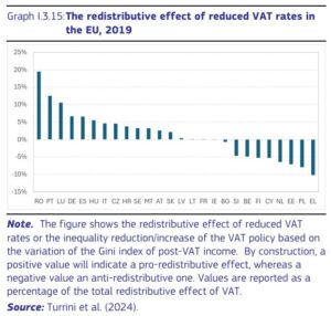 Ωστόσο, στην πράξη, υπάρχει σημαντική διακύμανση μεταξύ των κρατών-μελών όσον αφορά τη συνολική αναδιανεμητική επίδραση των μειωμένων συντελεστών ΦΠΑ. Στη Ρουμανία προκαλεί όφελος κατά 19% και στην Πορτογαλία κατά 13%. Αντίθετα, οι μειωμένοι συντελεστές ΦΠΑ εκτιμάται ότι προκαλούν περαιτέρω επιδείνωση της κατάστασης σε οκτώ κράτη-μέλη, με τη μεγαλύτερη επίδραση να καταγράφεται στην Ελλάδα, με επόμενες χώρες την Πολωνία και την Ολλανδία. «Η αρνητική διανεμητική επίδραση προκαλείται από μειωμένους συντελεστές που δεν ωφελούν ιδιαίτερα τα φτωχότερα νοικοκυριά» εξηγεί η επιτροπή για την Ελλάδα…