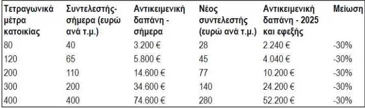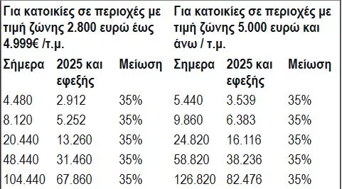 Σε περιοχές με τιμή ζώνης από 2.800 έως 4.999 ευρώ/τ.μ., η προσαύξηση περιορίζεται στο 30% (αντί 40%), οδηγώντας σε συνολική μείωση περίπου 35%. Για περιοχές με τιμές ζώνης άνω των 5.000 ευρώ/τ.μ., η προσαύξηση μειώνεται στο 58% από 70%, με αποτέλεσμα ανάλογη μείωση 35% στη συνολική αντικειμενική δαπάνη.