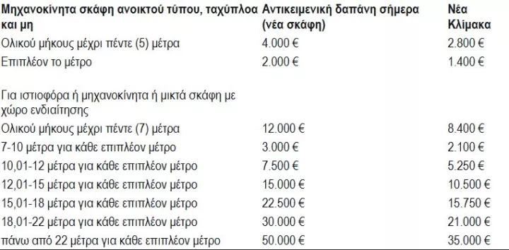 Αναπροσαρμογές προβλέπονται και για τα σκάφη αναψυχής. Η τεκμαρτή δαπάνη μειώνεται κατά 30% ακόμη και για νεότερα σκάφη, ενώ διατηρούνται οι προβλεπόμενες μειώσεις 15% και 30% για παλαιότητα άνω των 5 ή 10 ετών αντίστοιχα.