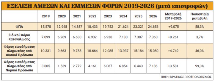 Οπως φαίνεται στον σχετικό πίνακα για την εξέλιξη των φορολογικών εσόδων, μετά επιστροφών, την περίοδο 2019-2026 τα έσοδα από ΦΠΑ θα έχουν αυξηθεί κατά 9,08 δισ. ευρώ, οι ειδικοί φόροι κατανάλωσης κατά 261 εκατ. ευρώ, ο φόρος εισοδήματος φυσικών προσώπων κατά 4,75 δισ. ευρώ και ο φόρος εισοδήματος νομικών προσώπων κατά 3,58 δισ. ευρώ. Η ποσοστιαία μεταβολή τους κυμαίνεται από 3,7% έως και 99% για τον φόρο στις επιχειρήσεις!