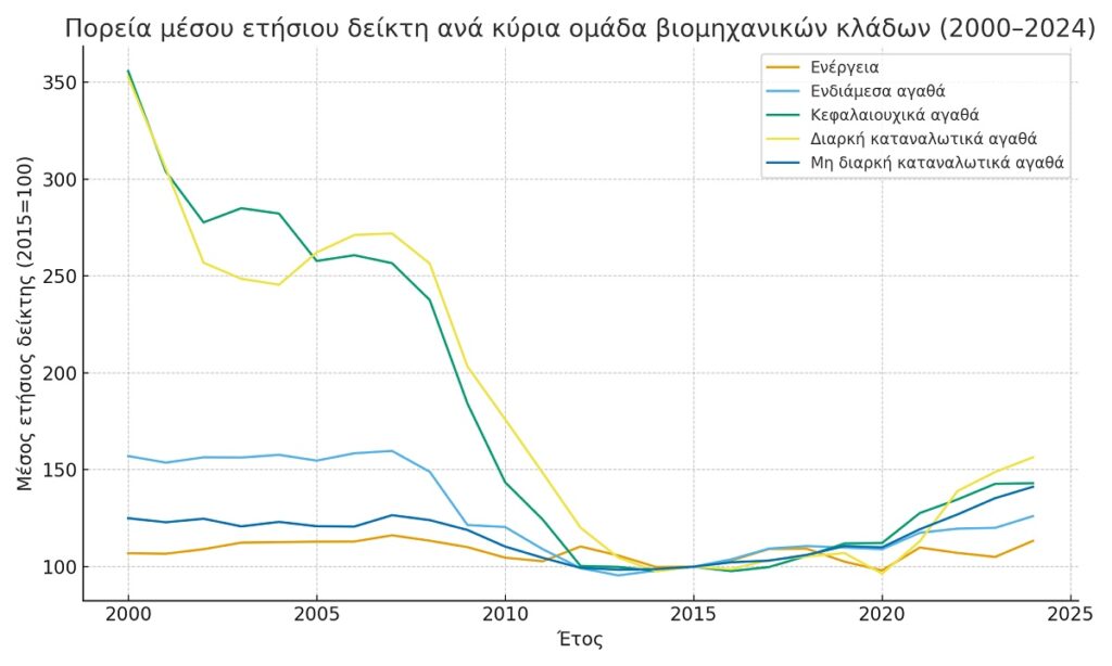 • Κεφαλαιουχικά αγαθά (επενδυτικά αγαθά). Πρόκειται για τον πιο «τραυματισμένο» κλάδο σε μακροχρόνιο ορίζοντα, καθώς η συνολική μεταβολή την περίοδο 2000-2024 είναι έντονα αρνητικά (περίπου -60%). Η κατάρρευση επενδύσεων, κατασκευών, δημόσιων έργων και χρηματοδότησης χτύπησε καταλυτικά τα κεφαλαιουχικά αγαθά. Αν και το 2024 ο δείκτης ήταν υψηλότερα κατά 43% σε σχέση με το 2015, ακόμη βρίσκεται πολύ χαμηλότερα από την «υψηλή» περίοδο του 2000-2007.