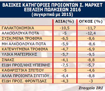 Σε αυτά τα στοιχεία προστίθενται και τα ευρήματα του Iνστιτούτου Έρευνας Λιανεμπορίου Kαταναλωτικών Aγαθών που δείχνουν ότι τόσο οι αλυσίδες σούπερ μάρκετ όσο και οι προμηθευτές τους αναμένουν περαιτέρω μείωση των πωλήσεων (από 2& έως και 5%) το α’ εξάμηνο του 2017 σε σύγκριση με το β’ εξάμηνο του 2016.