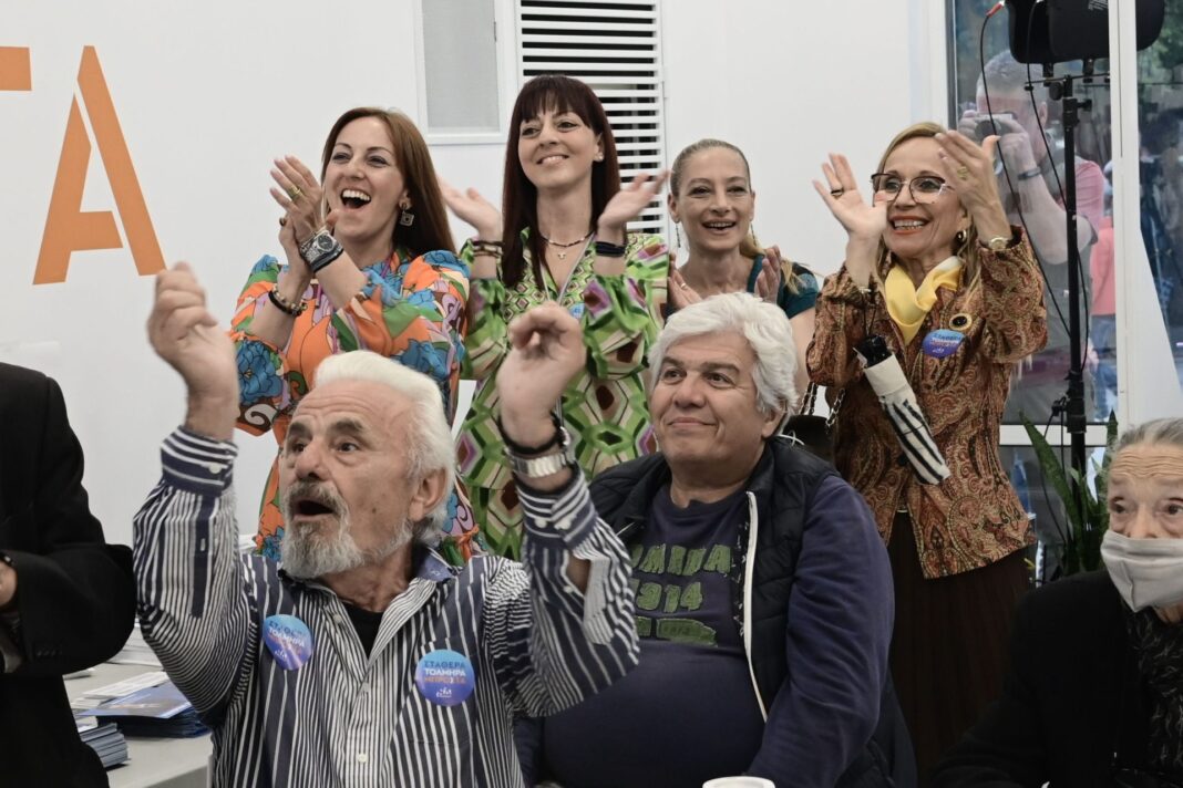 Ξέσπασαν σε χειροκροτήματα στα γραφεία της Νέας Δημοκρατίας στην Πειραιώς, τη στιγμή που ανακοινώθηκαν τα exit poll για τις βουλευτικές εκλογές της 21ης Μαΐου 2023.