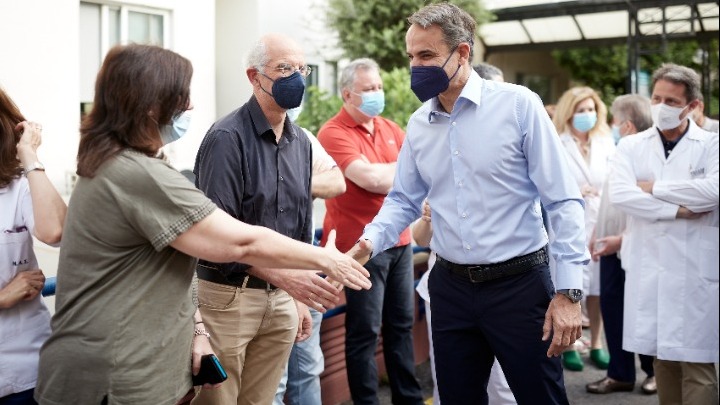 Ο κ. Μητσοτάκης συναντήθηκε και συζήτησε με το ιατρικό και νοσηλευτικό προσωπικό που συμμετέχει στο νέο πρόγραμμα «ΟΙΚΟΘΕΝ» υπό τον υπεύθυνο ιατρό, Μιχάλη Νικολάου, για τη χορήγηση θεραπειών σε ογκολογικούς ασθενείς στο σπίτι και ενημερώθηκε για τη λειτουργία του νέου προγράμματος.