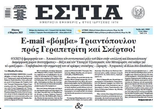 Ηλεκτρονικό μήνυμα (email) «βόμβα» το οποίο φέρεται ότι απέστειλε ο υφυπουργός παρά τω Πρωθυπουργώ Χρήστος Τριαντόπουλος λίγες μόλις μέρες μετά το δυστύχημα των Τεμπών στον τότε Υπουργό Επικρατείας Γιώργο Γεραπετρίτη, στον τότε υφυπουργό Άκη Σκέρτσο, στον Γενικό Γραμματέα του Υπουργείου Μεταφορών Γιάννη Ξιφαρά και στον Περιφερειάρχη Θεσσαλίας Κώστα Αγοραστό και με το οποίο «σφραγίζεται» με την υπογραφή του ο συντονιστικός του ρόλος στο περίφημο «μπάζωμα» των Τεμπών αποκαλύπτει σήμερα η «Εστία».