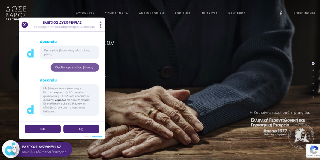 Η Docandu, με έντονο αίσθημα κοινωνικής προσφοράς, ανέπτυξε μία εφαρμογή ψηφιακής υγείας, ώστε να διευκολύνει την ορθή ενημέρωση αλλά και να μπορεί να λάβει εύκολα και γρήγορα, όποιος το επιθυμεί, μια αξιόπιστη ιατρική συμβουλή ως το πρώτο, αλλά πολύ σημαντικό, βήμα μιας ολοκληρωμένης ιατρικής φροντίδας. Η εφαρμογή αυτή της Docandu, η οποία θα διατεθεί δωρεάν σε όλο τον ελληνικό πληθυσμό, έρχεται να ενισχύσει την καμπάνια της Nutricia «ΔΩΣΕ ΒΑΡΟΣ ΣΤΑ ΣΗΜΑΔΙΑ», που είναι σε εξέλιξη εδώ και δύο χρόνια και τελεί υπό την αιγίδα της Ελληνικής Γεροντολογικής και Γηριατρικής Εταιρείας. Η συνεργασία των δύο εταιρειών αναμένεται να έχει θετικό αντίκτυπο στη μάχη κατά της δυσθρεψίας, μέσω της εκπαίδευσης του κοινού στην αναγνώριση και την διατροφική διαχείριση της δυσθρεψίας.
