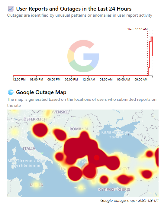Σημαντική διακοπή στη λειτουργία υπηρεσιών της Google σημειώθηκε το πρωί της Πέμπτης στην Ανατολική Ευρώπη, με τις μεγαλύτερες επιπτώσεις να καταγράφονται στα Βαλκάνια, την Τουρκία και τη Γεωργία. Το πρόβλημα ξεκίνησε στις 08:10 GMT και επηρέασε βασικές πλατφόρμες, όπως η μηχανή αναζήτησης, το Gmail, τα Google Docs, καθώς και δημοφιλείς εφαρμογές ψυχαγωγίας όπως το YouTube και το Spotify.