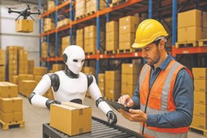 Επιπλέον, τα συστήματα ρομποτικής υποστηρίζουν τους εργαζομένους σε βαριά ή επαναλαμβανόμενα έργα. Τα αυτόνομα οχήματα μεταφοράς υλικών (AMRs) μετακινούν παλέτες και καλάθια μέσα στην αποθήκη, ακολουθώντας δυναμικές διαδρομές και συνεργάζονται με ανθρώπους σε περιορισμένους χώρους, ενώ τα ρομπότ συλλογής (cobots) επιταχύνουν τη διαδικασία παραγγελιοληψίας. Η συνεργασία ανθρώπου-μηχανής αυξάνει την παραγωγικότητα έως και 85%, σύμφωνα με μελέτες, και μειώνει τον κίνδυνο τραυματισμών.