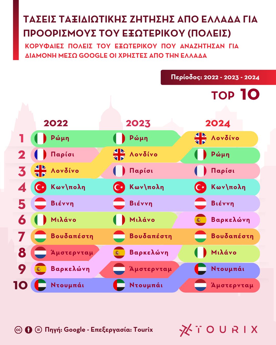 Η ανάλυση δείχνει πως το Λονδίνο, το οποίο το 2022 βρισκόταν στην τρίτη θέση, σταδιακά ανέβηκε στην κορυφή της λίστας για το 2024. Η Ρώμη υποχωρεί στη δεύτερη θέση, ενώ οι υπόλοιποι δημοφιλείς προορισμοί διατηρούν τη θέση τους με μικρές διαφοροποιήσεις. Η Κωνσταντινούπολη και η Βιέννη εξακολουθούν να βρίσκονται στην τέταρτη και πέμπτη θέση αντίστοιχα, επιβεβαιώνοντας τη σταθερή προτίμηση των Ελλήνων ταξιδιωτών σε αυτές τις πόλεις.