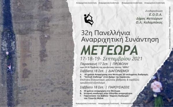 H Ελληνική Ομοσπονδία Ορειβασίας –Αναρρίχησης διοργανώνει τη 32η Πανελλήνια Αναρριχητική Συνάντηση που θα πραγματοποιηθεί στις 17, 18 και 19 Σεπτεμβρίου στην περιοχή των Μετεώρων.