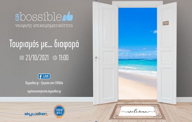 Ιδανικά συμπληρώνονται οι δράσεις του GRBossible και στον χώρο του τουρισμού με άλλη μια διαδικτυακή ημερίδα που εντάσσεται στη δέσμη πρωτοβουλιών του skywalker.gr «Βγαίνουμε μπροστά» με τίτλο «Τουρισμός με… διαφορά».