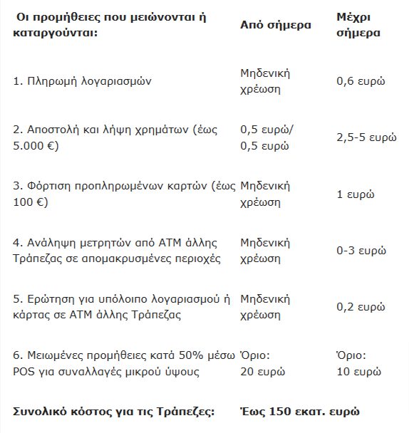Οι τραπεζικές προμήθειες που καταργούνται ή μειώνονται είναι οι εξής: