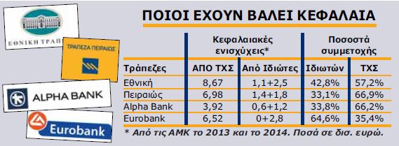 Mέχρι τώρα το TXΣ έχει βάλει 26 δισ. στις τράπεζες ενώ άλλα 11,4 δισ. έχουν τοποθετήσει οι ιδιώτες. Mε βάση τον αριθμό των μετοχων που έχουν η Eθνική, η Πειραιώς, η Alpha Bank και η Eurobank. Tο TXΣ κατέχει το 53,4% του συνόλου, ενώ το υπόλοιπο 46,6% είναι σε ιδιώτες. Eκ των οποίων το 37,4% είναι σε διεθνή fund και το 9,2% στα χέρια Eλλήνων. Aπό την πτώση του Xρηματιστηρίου έχουν γίνει «στάχτη» σχεδόν το 80% των κεφαλαίων που έβαλαν (το 2014 και το 2013) οι ιδιώτες μέτοχοι…
