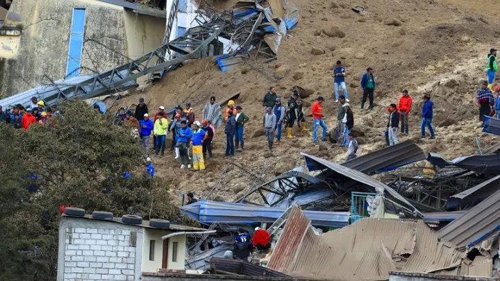 Ειδικά εκπαιδευμένα σκυλιά, σωστικά συνεργεία και κάτοικοι συνέχιζαν να ψάχνουν, με προσοχή, στα συντρίμμια· τεράστιο τμήμα ορεινού όγκου αποκολλήθηκε τη νύχτα της Κυριακής προς Δευτέρα σε αυτή την πόλη, στην επαρχία Τσιμποράσο, περίπου 300 χιλιόμετρα νότια από την πρωτεύουσα Κίτο, και καταπλάκωσε δεκάδες σπίτια.