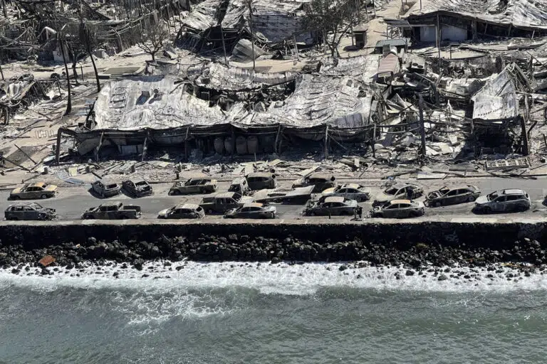 Η Λαχάινα, στα δυτικά παράλια του Μάουι, καταστράφηκε σχεδόν όλη από τις φλόγες. Χιλιάδες κτίρια καταστράφηκαν, πολλά μετατράπηκαν σε γκρίζους σωρούς στάχτης.