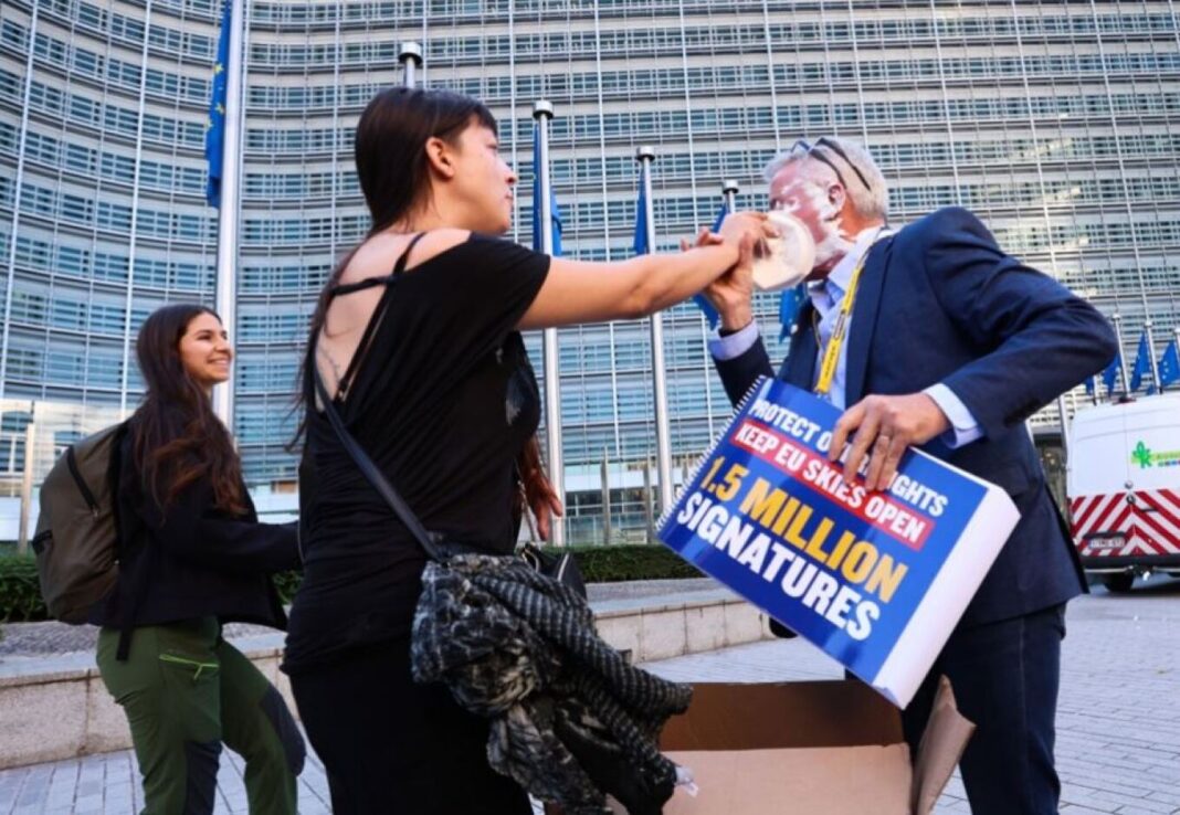 Μία… γλυκιά υποδοχή με τάρτα στο πρόσωπο επεφύλαξαν δύο ακτιβίστριες για το περιβάλλον στον διευθύνοντα σύμβουλο της Ryanair Μάικλ Ο’Λίρι, έξω από την έδρα της Ευρωπαϊκής Επιτροπής στις Βρυξέλλες.