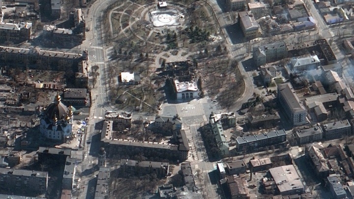 Η αμερικανική εταιρεία διαστημικών τεχνολογιών Maxar Technologies, η οποία εξειδικεύεται κυρίως στις δορυφορικές εικόνες, είχε δημοσιεύσει στις 16 Μαρτίου φωτογραφία του Θεάτρου Δράματος της Μαριούπολης, η οποία είχε ληφθεί δύο ημέρες νωρίτερα, σύμφωνα με την εταιρεία. Σύμφωνα με την φωτογραφία, στην οποία είχε πρόσβαση το AFP, η λέξη “παιδιά” είχε γραφτεί στο έδαφος, με τεράστια λευκά γράμματα και στα ρωσικά, μπροστά και πίσω από το κτίριο.